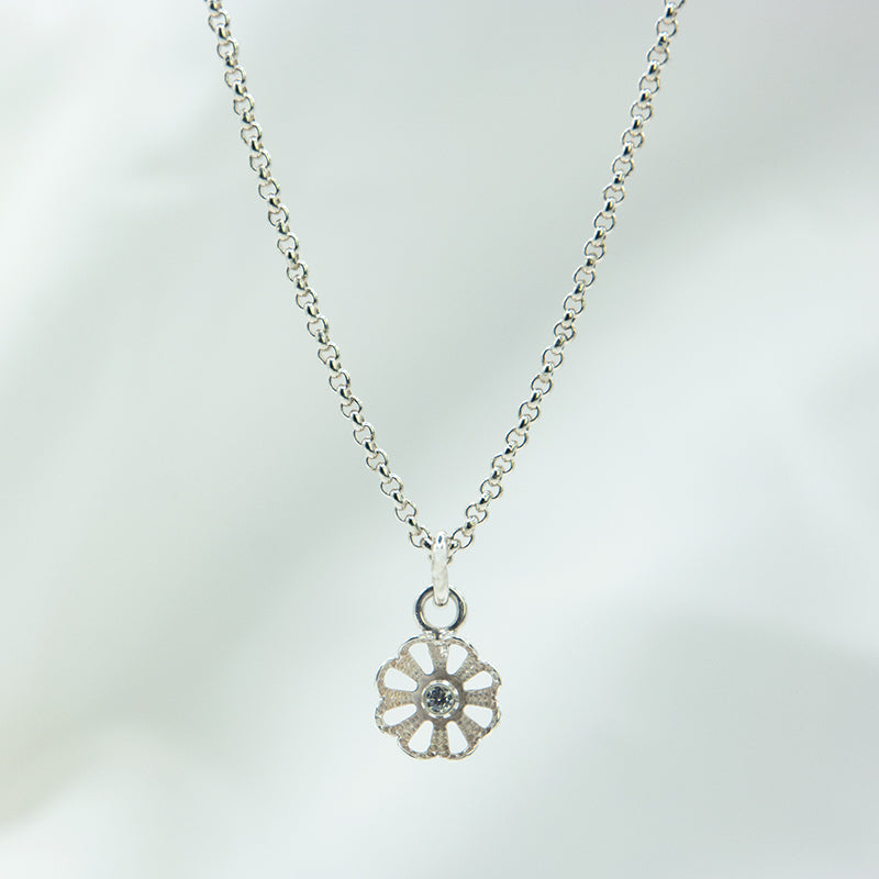 Hang de zilveren bloem hanger aan een ketting die je al hebt of bestel er meteen een mooie ketting bij. De ketting die bij de bloem geleverd wordt is van massief zilver en is een stevige maar toch fijne schakel.